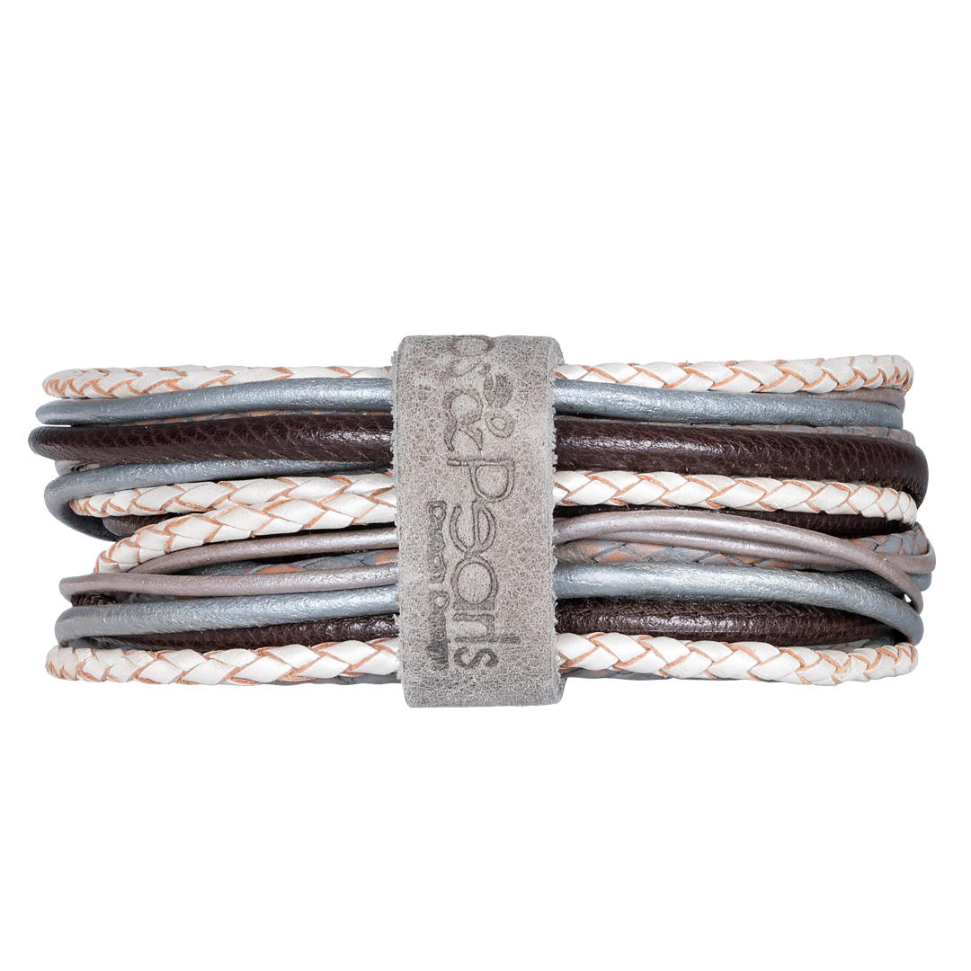 Das Bracelet wird mehrfach ums Handgelenk gewickelt und besteht aus 6 Ledersträngen. Die Grösse kann sehr gut variert werden und passt sowohl an schmale als auch an etwas kräftigere Handgelenke.